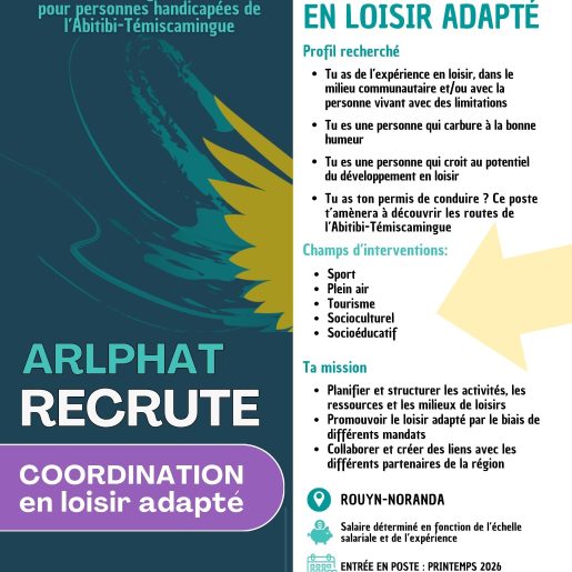L’Association régionale de loisirs pour personnes handicapées de l’Abitibi-Témiscamingue a pour mission de promouvoir le loisir des personnes handicapées.